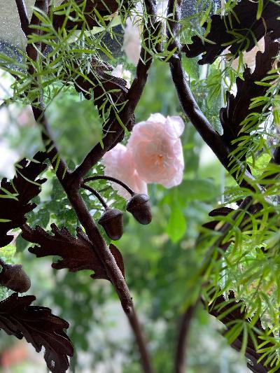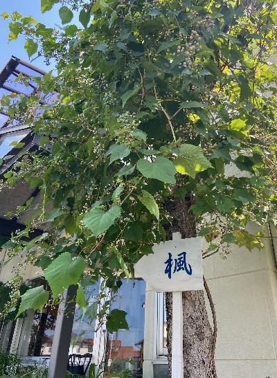 数年前に玄関横に鳥が運んできた野葡萄が大きくなり枝を切られた木に巻き付いて宝石のような可愛い実がたくさんつきました