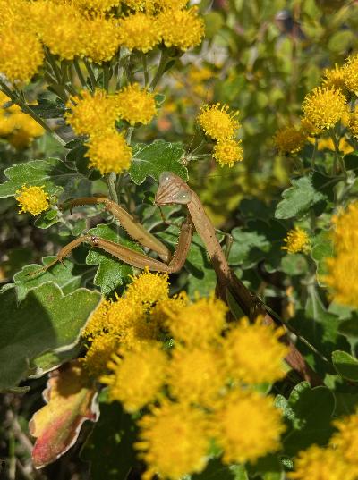 綺麗な翡翠色の目をしたツートンカラーのカマキリでした