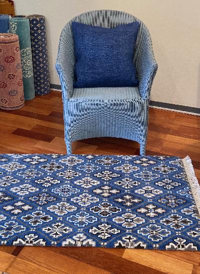 先日、落ち着いたブルーの花菱紋様のラグが入荷しました