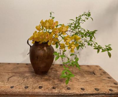 トルコの古い銅の壺にコバノズイナとシンビジューム |