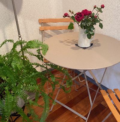 お客様への納品まで展示中のフランスのfermob社のガーデンセットに最後のバラを